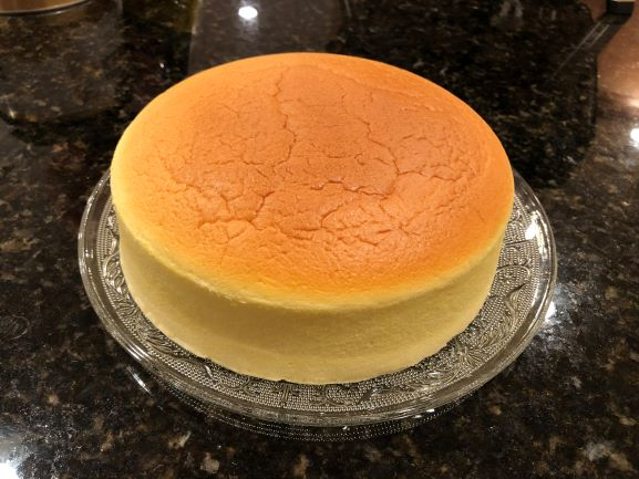 日式轻乳酪蛋糕 Freshly baked. 8 inches in diameter. A perfect cake should have a very smooth top surface. There is a room for improvement. Have to say the taste is really good, and even better with ice-cream!